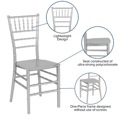 The Black Resin Chiavari Chair is ideal for weddings, banquets and special events from casual to the most elegant. Constructed of ultra-strong resin and polycarbonate, this chair is very lightweight, yet extremely strong and wobble-free. These beautiful chairs ship fully assembled, can be stacked 8 high for storage. With its durable, lightweight construction and elegant styling, this Chiavari chair will be the prime seating choice for all of your special events. You can use the chair outdoors, which makes it a great choice for summertime gatherings and special events. Additional Features: One-Piece frame designed without use of screws, Seat constructed of ultra-strong polycarbonate, Non-Stick and Anti-Static Finish, Wobble Free Construction, Ships Fully Assembled, Designed for Indoor or Outdoor Use, Designed for Commercial Use, 2 Year Limited Warranty on Frame