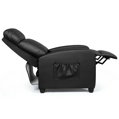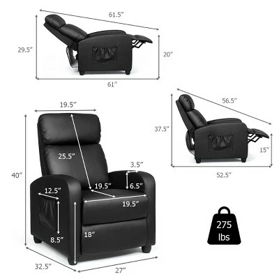 This is our brand new contemporary massage recliner chair, which combines fashion and functionality to relax your body and offer continuous service. With retractable footrest and adjustable backrest, this recliner chair is functional for optimal comfort, perfect for reading, sleeping or napping. Conforming to ergonomic principle, the massage sofa supports your neck, arm, back, and legs in the correct angle so as to offer utmost comfort. Featuring 2 vibrating nodes ,3 adjustable vibration levels and 8 modes of vibrating massage, it is ideal for anxiety and tiredness relief, especially suitable for those working for long sessions. If you are looking for a single recliner chair to go in your living room, bedroom, home theater or even your office, this is the best choice! Don’t hesitate to buy it!. Specification: Material: Fabric, iron, plastic, sponge, spring. Certification: UL. Overall dimensions: 32.5” x 27” x 40” (L x W x H). Open dimensions: 27” x 61” x 29.5” (L x W x H). Weight capacity: 275 lbs. Net weight: 54 lbs. Package includes:. 1 x Massage recliner chair. 1 x Remote controller. 1 x Power plug.