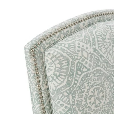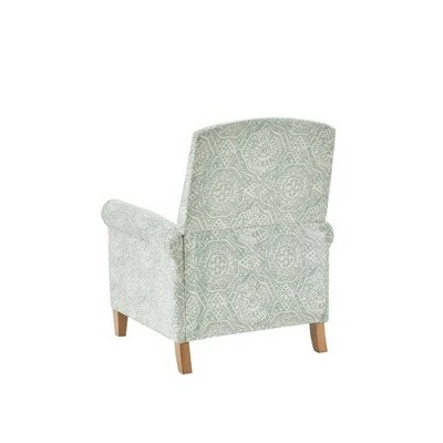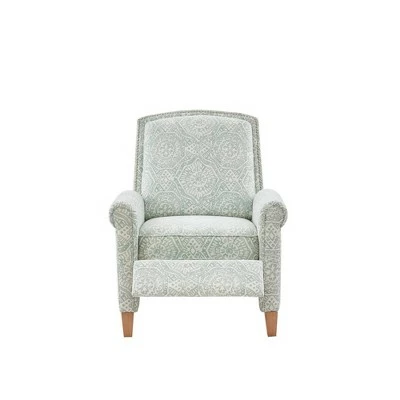 The Linda Push Back Recliner offers an elegant and sophisticated update to your living room decor. This reclining chair is upholstered in a tonal printed fabric that creates a rich transitional look. The pewter nailhead detailing and rounded arms add the perfect touches to elevate the design. An elm wood finish on the solid wood legs complements the upholstery. With its high back, this push back recliner brings comfort and style to your home decor.