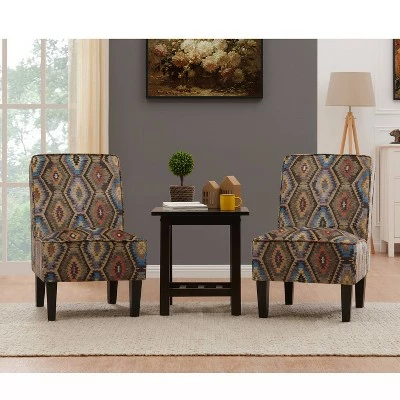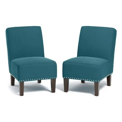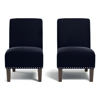 This set of 2 armless slipper chairs feature a curved square back, sinuous springs and deep seating with a thick foam cushion for extraordinary comfort. With dark espresso finish solid wood legs and a designer fabric, these chairs will add just the right touch to a living room, bedroom or office and transform your home.