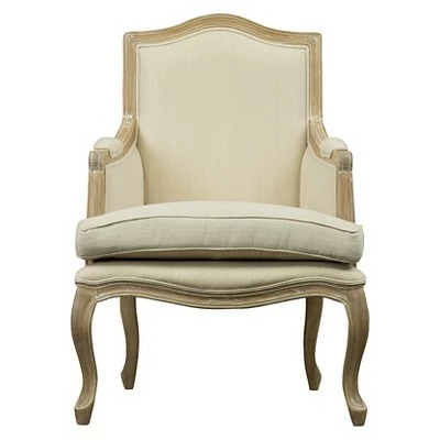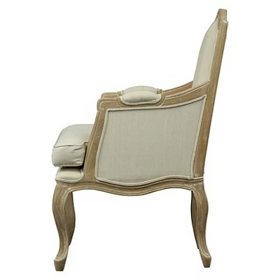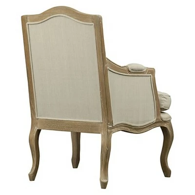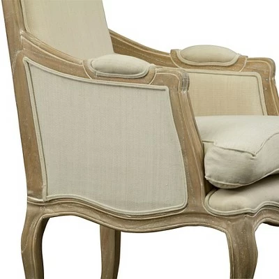 Revealing outstanding attention to detail via its white-streaked, distressed antiqued finish, our Nivernais Wood Traditional French Accent Chair will gain enthusiastic applause from discount-minded decorating divas. Bringing traditional style to the modern age, this accent chair pairs a genuine mindi-wood frame with Highly versatile neutral beige linen. Foam cushions provide comfort without sacrificing style. Dimensions: 37.5″ High x 26″ Wide x 21.5″ Long; Seat: 19″ High x 26″ Wide x 18.25″ Deep