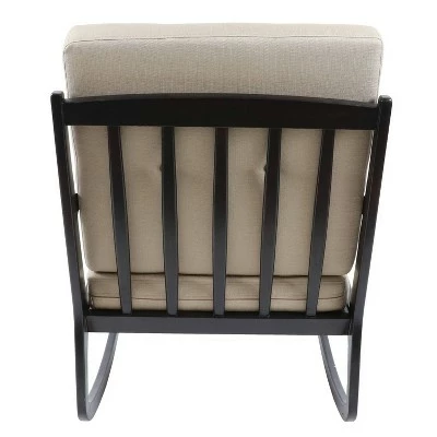 Modern lines blend with traditional functionality in this stylish, sharp rocking chair. The wood frame in a dark finish is slim with smooth, soft curves, which contrasts slightly with the cushions. Square in shape and featuring an allover crosshatch texture, these two cushions are positioned at the seat and back, with tufted buttons adding to the traditional appeal. A slatted frame back creates comfort and finishes the look.