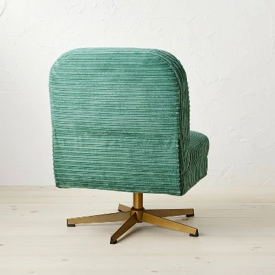 Anyone with a taste for colorful, stylish furniture is sure to love this Spaulding Channel Velvet Accent Swivel Chair from Opalhouseโข designed with Jungalowโข. Its thick cushioning is upholstered with striped grooves in soft, teal green fabric to give your home a lounging spot that’s warm, comfy and charmingly colorful all at once. This bold design is complemented by the chair’s swiveling, brass-finished base. Great as a standalone piece, it also coordinates nicely with other bohemian-style furniture.
