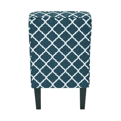 This armless slipper chair features a curved square back, sinuous springs and deep seating with a thick foam cushion for extraordinary comfort. The dark espresso finish solid wood legs and navy blue and white trellis pattern fabric complete the designer look. Ideal for small space living, this armless chair will be a great accent chair to add to your living room, bedroom or office.