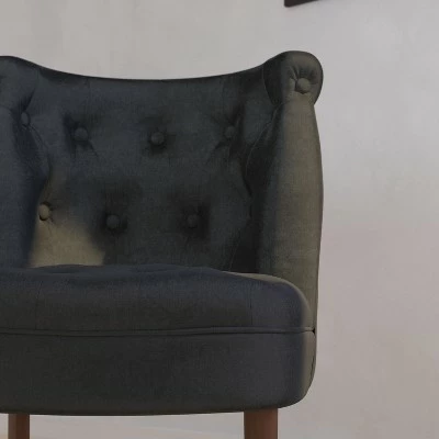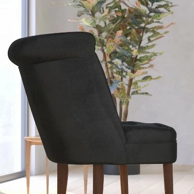 - Product Name: Merrick Lane Accent Side Chair with Curved Back and Rounded Seat Black Fabric Button Tufted Chair with Mahogany Finished Wood Legs