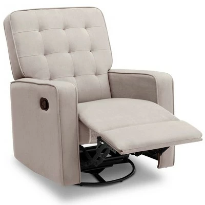 Ideal for story time or late-night feedings, the Delta Children Gavin Nursery Glider Swivel Recliner featuring LiveSmart Fabric by Culp will become the ultimate hangout spot for you and your baby. The chair features plenty of ways to unwind, it has a 360-degree swivel, gliding motion, and an easy-to-reach reclining mechanism that offers two recline positions. You can keep the seat upright and just prop up your legs or fully recline for maximum relaxation. Upholstered in the most durable fabric on the market, this recliner features LiveSmart technology, which allows spills to bead up, sitting on top of the fabric until you gently blot them away. The fabric does more than prevent stains and repel moisture–it resists everyday messes to keep the chair looking as beautiful as the day you bought it. And that’s not all, this versatile recliner works well in the nursery or any other living space in your home. Its sophisticated design with buttonless tufting and streamlined silhouette makes it a timeless choice. The Delta Children Gavin Nursery Glider Swivel Recliner featuring LiveSmart Fabric by Culp is available in a number of versatile neutrals that work well with everything.