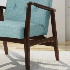 Beautify your living room or garden room with this beige accent chair. The seat is both robust and delightful. Fabric-like vinyl upholstery exudes itself in a box cushion seat and a loose back with a pillow. The wooden canted block legs and curved arms are a mellow cream color. This kind and calming chair will change the aura of your home.