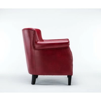 Let the Holly Red Club Chair wrap you in comfort and style. Upholstered in an innovative leather gel that provides the soft touch of a top grain leather at a great value. Ideal for your den, bedroom, office, or living room, this chair is accented by timeless and on-trend muted nailhead trim. Sturdy construction includes a sturdy wood frame, no sag springs and a 2.2 density foam cushion. Choose one today to liven up your space.Features : Red UpholsteryUpholstery: Semi LeatherHardwood and plywood frame constructionEasy to clean just wipe with damp clothSinuous “no sag” springs2.2 density foam seat cushionSeat cushion is 4.5″ thickLeather gel technology gives the look and feel of top grain leather and is easy to maintainSolid wood legsMuted chrome nail head trimNo Assembly RequiredSpecifications : Seat Dimensions : 18.9″ high x 19.3″ wide x 21.65″ deepUpholstery Material : Leather gelTarget Audience : All AgesSurface Material : upholsteredMaximum Seating Capacity : 1Assembly details : No assembly requiredFurniture Subtype : Club ChairsArm Height : 26″