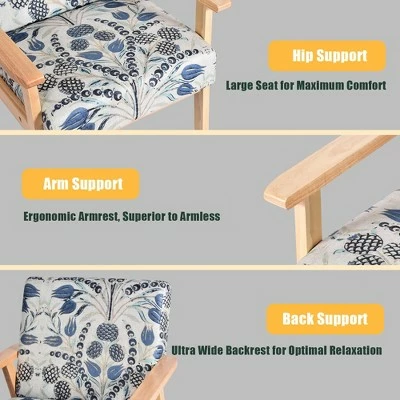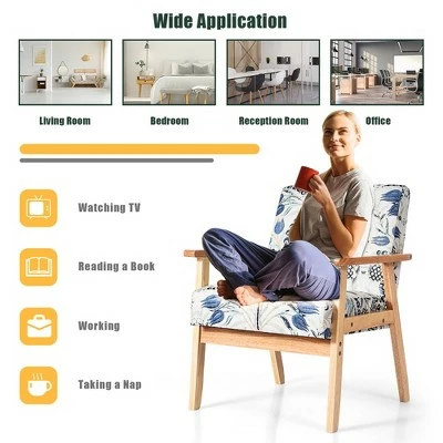Do you want to sit in a comfortable chair to rest and watch TV to spend your free time? Our accent chair is designed for improving your life! . Wide backrest and thick cushion are padded with high-quality sponge to ensure optimal softness and good resilience. You don’t worry about whether it will deform after a period of time. Solid wood frame makes the chair stable and durable. And breathable linen cover with skin-friendly touch will offer you maximum comfort. What’s more, rubber wood armrest and ergonomic curved back can perfectly conform to the curve of the body to fully relax yourself. Beautiful patterns enhance your home decor style. With simple and elegant style, it is just what you need for your living room to receive your friends! . Specification: Color: Yellow Blue Floral. Material: Rubber Wood + Linen + Sponge. Overall Dimension: 25” x 26.5” x 32”(L x W x H) . Height from the ground to seat: 17”. Net Weight: 24 lbs. Weight Capacity: 265 lbs. Package includes: . 1 x Accent Chair. 1 x Instruction.
