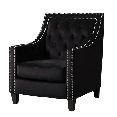 Enjoy the beautiful styling of the Valerie Nailhead Tufted Accent Chair by Abbyson Living as an accent chair in any room of your home. This transitional style velvet club chair is wrapped in a luxurious and soft velvet fabric upholstery that features a diamond button tufted inner detail along the back and gracefully sloping dropped arm rests. Dual nailhead trim provides a stunning and glamorous border accent, and the solid mahogany finished wood legs provide a rich and natural finishing touch.