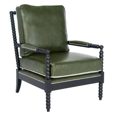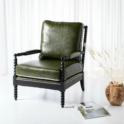 Add stately character to the study, living room or home office with the vintage good-looks of the Annabelle Leather Arm Chair. Annabelle’s sculpted oak body, beaded arms, and nailhead accents bring the elegance of traditional ornate design to modern room décor. Made using faux leather in forest green, Annabelle is as comfortable as it is stylish.