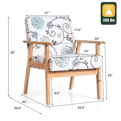 Do you want to sit in a comfortable chair to rest and watch TV to spend your free time? Our accent chair is designed for improving your life! . Wide backrest and thick cushion are padded with high-quality sponge to ensure optimal softness and good resilience. You don’t worry about whether it will deform after a period of time. Solid wood frame makes the chair stable and durable. And breathable linen cover with skin-friendly touch will offer you max imum comfort. What’s more, rubber wood armrest and ergonomic curved back can perfectly conform to the curve of the body to fully relax yourself. Beautiful patterns enhance your home decor style. With simple and elegant style, it is just what you need for your living room to receive your friends! . Specification: Color: As the Picture Shown. Material: Rubber Wood + Linen + Sponge. Overall Dimension: 25” x 26.5” x 32”(L x W x H) . Height from the ground to seat: 17”. Net Weight: 24 lbs. Weight Capacity: 265 lbs. Package includes: . 1 x Accent Chair. 1 x Instruction.