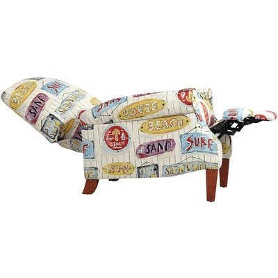- Sunshine Beach polyester fabric with a surf, beach-themed nautical pattern. Wood frame construction. Leg rest mechanism. Push-thru-arm recliner chair with tension adjustments.
