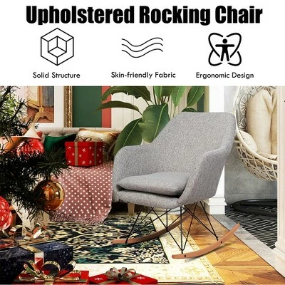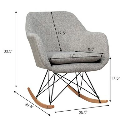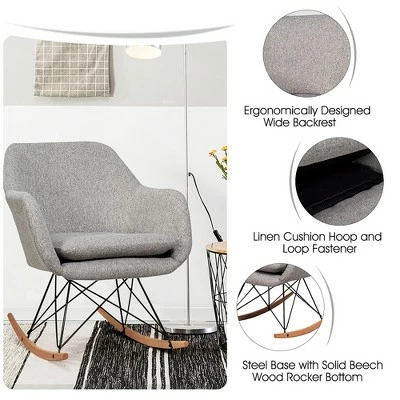 This stylish rocking chair can not only provide you a relaxing place, but also decorate your house better.. Covered by linen fabric and constructed by steel and beech wood, this single chair is comfortable, durable and stable. You will sit comfortably and feel relax with 3β cushioned seat and cozy armrests. The specially designed arc base with perfect angle can effectively help you relax your body, thus you will have a super smooth and comfortable rocking experience. High quality wood frame ensures long-term service, so that the massage rocking chair is strong enough to withstand the weight of 250 LBS.. Specification: Color: Grey. Material: Beech wood, Sponge, Linen . Overall Dimension: 25.5β x 29.5β x 33.5β (L x W x H). Net Weight: 16.5 lbs. Load Capacity: 250 lbs. . Package IncludesοΌ. 1 x Rocking Chair . 1 x Assembly Instruction.