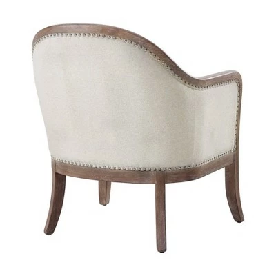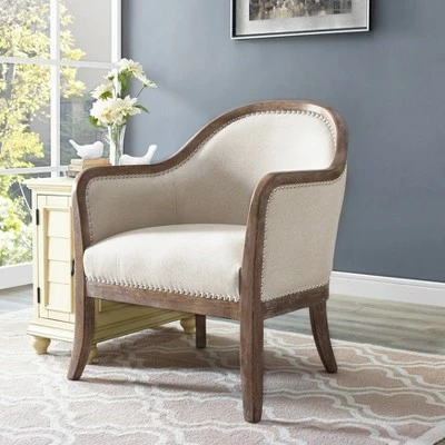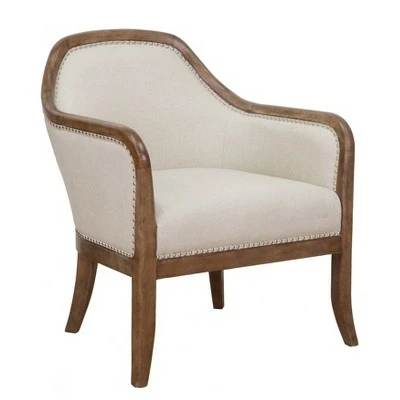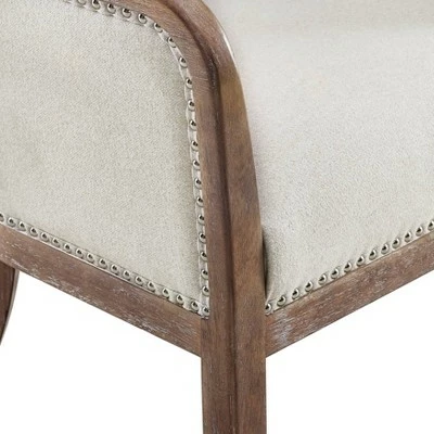 Casually chic and comfy too, this accent chair complements modern farmhouse styling whether it be for your living room or the head of your dining table. Its exposed wood frame highlights its shapely form, is finished in a neutral light oak finish, and is accentuated with nailhead trim in brushed nickel.