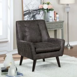 The placid grace of mid-century modern style peeks through the design of this accent chair with its espresso finished tapered and flared legs. It features button-tufted linen upholstery that has a soft touch with a welted untroubled rim. The barrel-shaped seat with flared arms caresses you in a calming embrace with a semi-firm comfort.