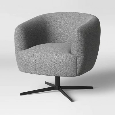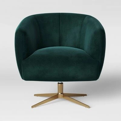 The Morpho Swivel Velvet Armchair with Metal Base from Opalhouseβ’ makes the perfect addition to your mod-inspired living room, den or master suite. This fabric-upholstered accent chair features a round, tub-style design for a distinctly mid-century feel, and it comes in a rich jewel tone that adds a sense of dimension to your space. A gold-tone metal pedestal base adds a little shine and contrasts beautifully with the texture of the velvet upholstery, while the swivel design makes it easy to adjust the direction of the seat. Dress it up with an artsy throw pillow for an eclectic, textured look, or leave it unadorned to let the chic style speak for itself.
