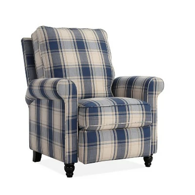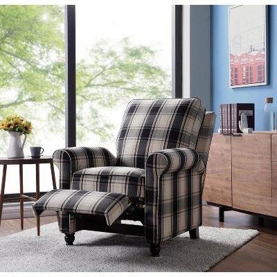 Sit back and relax in this transitional ProLounger reclining chair with a rolled arm design. Simply push back to recline, no levers or buttons required for comfortable long term sitting, TV viewing or a relaxed recline. Comfortable sit & arm support, long-term sitting, TV viewing, relaxed recline. Style lends itself to both contemporary and more modern living, media and master bedrooms. Spot clean only. 40% cotton, 60% polyester. Solid wood turned front legs and tapered back legs in dark espresso finish for added style and strength. Engineered mixed hardwood frame construction for added strength. Wrapped pocket coils for a custom sit. Polyester fiber and foam filling with sinuous springs for added comfort. HANDY LOCK easy connect, simply slide and click for easy no tool assembly. Seats up to 300lbs. Recliner is 66″ fully reclined, 22.5″ wide seat, 26″ from the seat to the top of the recliner. Innovative engineering and packaging design enable the recliner to be assembled in the actual room. Our efficient product and package design allows us to use less fossil fuel throughout the entire supply chain than standard, set-up furniture uses. Break it back down to recycle at the end of use for additional peace of mind. Ships in one (1) box. Takes less than 15 minutes to assemble. Imported . Color may vary