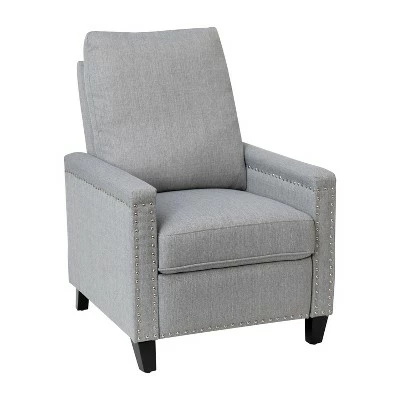 This transitional recliner with luxury detailing will make a statement in any room in your home. Featuring durable fabric upholstery in gray with nailhead accent trim for a modern feel and plush padding for ultimate comfort, this recliner is the best of both worlds. Wooden legs ground the design and offer a natural look. The easy push back recline feature gives you freedom to place this piece without worrying about an available outlet or accommodating a lever. With assembly taking less than 10 minutes, you don’t have to wait to put your feet up and unwind from the pressures of your day. For lasting use, spot clean when needed with a neutral detergent and water. When you need a place to relax, this recliner will provide maximum comfort without sacrificing high style or breaking the bank. Additional Features: Spot Clean with Mild Detergent and Water