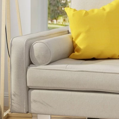 This modern chaise loveseat is a wonderful addition to any living room. Featuring iron legs for a stylish modern look along with fabric covered cushions and deep seating, this is a must have chaise loveseat. Also included is a small round pillow for added comfort no matter where you sit on this loveseat.