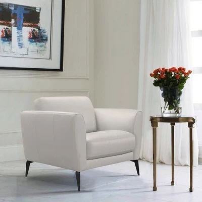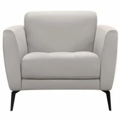 The Armen Living Hope contemporary genuine leather sofa chair is an exceptional choice for enhancing the modern living room aesthetic. The Hope’s highly resilient foam and Dacron fiber padding perfectly support the plush genuine cowhide leather upholstery, assuring that the upholstery will not wrinkle or crack through prolonged use. Featuring a tufted cushion seat and accented by elegant black metal legs, the Hope chair is the result of combining the utmost degree of comfort with fashion forward design. For a cohesive home decor experience, consider pairing the Hope chair with the Hope loveseat and sofa. The Hope sofa chair is available in elegant gray genuine leather.