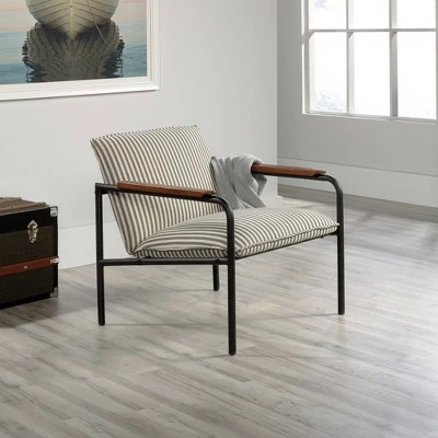 Stylish seating is a must-have in your home. Accentuate your living space by adding charming design and comfort to any room in your home with this chair from the Vista Key collection. This beautiful lounge chair features an upholstered seat and back for comfort you can enjoy while you sit back and scroll on your smartphone or relax while watching the evening news. Its two armrests are accented with wood arm caps for an extra touch of elegant style that is sure to catch the eye of all your guests. Attractive from every angle, this modern inspired accent chair is the perfect accent no matter where it stands in your home – the living room, the dining room or in your office! With its Gray and white pinstripe design paired with a durable, powder coated metal frame, this beauty of a chair gives your home the style you want with the functionality you need.