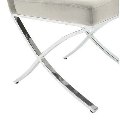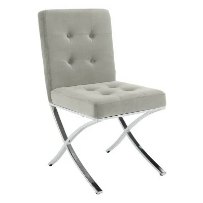 An instant sign of sophistication, this contemporary light gray tufted side chair brings refined relaxation to any living room. Designed with modern geometric lines and generously button tufted velvet style upholstery, its polished chrome legs make it an instant new classic. Constructed from chrome colored iron, this stylish chair is able to support up to two hundred and seventy five pounds. The Walsh tufted chair is the perfect addition for Contemporary, Modern, or Retro style interiors.