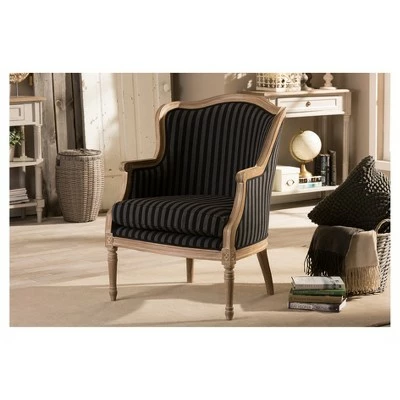 Classic contouring, contrasting leg designs and the comfort of cotton combine to create our Charlemagne Traditional French Accent Chair. Cedar wood frame and distressed brown oak wood finish (with white streaking) celebrate this timeless design. While the black and gray striped upholstery is a bit bolder than the Charlemagne’s mono-toned versions, the color scheme still is surprisingly versatile for accent placement or room positioning. There’s really no comparison to this attention to detail in the discount furniture arena. 36.25″H x 26.8″W x 26″D, SEAT 19.5″H X 23.2″W X 20″D