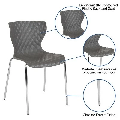 Bring excellent, reliable seating to any modern dining area, waiting room, or office with this black plastic stacking chair. Highlighted with a diamond quilted pattern, this chair offers plenty of style. It’s perfect for use as an accent side chair in waiting areas, cafes, lounges, and casual restaurants. This chair boasts a waterfall seat to help reduce leg strain and provide superior comfort for your guests during their stay. No place is off limits as this quilted plastic stack chair will hold up in a classroom, conference room, restaurant dining room or around the home. Additional Features: Molded Structure, Waterfall Seat reduces pressure on your legs, Chrome Frame Finish