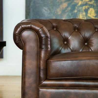 An Abbyson icon this piece is perfectly proportioned with its curving arms, button tufting and luxuriant leather upholstery that is finished with intricate hand-stitched detailing. Its durable kiln-dried hardwood frame is handled with a great deal of care and is put together by a unique and highly skilled craftsman to ensure longevity and strength as well as long-term comfort and satisfaction. Each cushion is fully padded with plush high-resiliency foam cushioning that is wrapped in a Dacron fill for massive comfort and support. Give your home a dose of exquisite style and comfort with this Abbyson favorite.