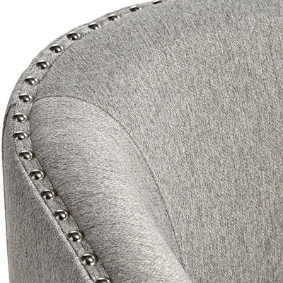 - Light gray polyester fabric. 360 degree swivel. Chrome nail head trim.