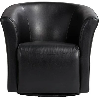 Use this swivel accent chair with a River black faux leather upholstery and thick padding to complement your stylish dΓ©cor with elegance and comfort.
