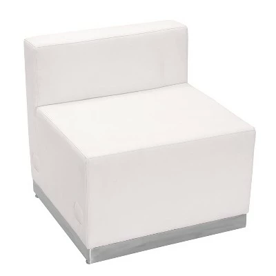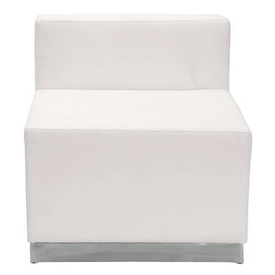 Moving your furniture around is a quick and easy way to change up the look and feel of your space so modular pieces like this black LeatherSoft upholstered chair are a must have. LeatherSoft is leather and polyurethane for added softness and durability. This modern chair gives an upscale, sophisticated look to any space and can be used in conjunction with other pieces or as a standalone. The armless design gives the illusion of space and creates an airy feel even in a small room. Supported by a brushed stainless steel base, this chair is durable and will withstand years of use. Adjustable floor glides ensure a level seating surface while the locking bolt connects this piece to chairs in this collection. As your business grows, you can add on more pieces and reconfigure your design. This innovative contemporary chair will bring comfort and trend-setting style to your waiting room, reception area or lounge. Additional Features: Padded Cushion, CAL 117 Fire Retardant Foam, Locking Bolt Connects Chairs, Brushed Stainless Steel Base with Adjustable Floor Glides, LeatherSoft is leather and polyurethane for added softness and durability