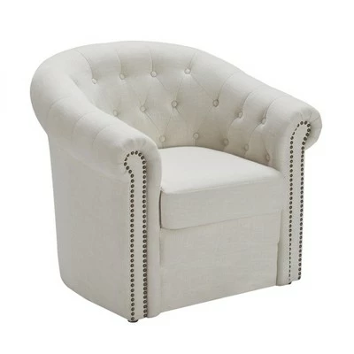 Capturing the feeling of the French countryside, the Finch Westport Tufted Club Chair brings home enduring cottage charisma. Inspired by the charming villages of Provence, this club chair makes it easy and affordable to surround yourself in vintage style, rich with distressed details and antique-inspired elements. Design features include flared arms and nail head accents. Seat cushion is removable. Constructed of solid and manufactured wood. Available in Ivory Linen, Antique Gray, and French Blue. Seat dimensions: 22 inches D x 19 inches W x 18 inches H. Upholstered in a high quality polyester linen fabric.