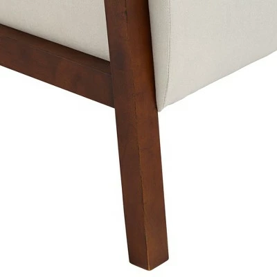 - Soft cream color fabric with vertical pleats. Walnut finish frame and legs. Open arms.