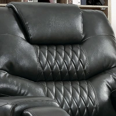 A faux leather reclining chair will steal the show in your living area, den, or office space. Those who sit in this leather recliner are cocooned in comfort with its plush track arms and extra plush, channel tufted backrest. Find attractive diamond stitching on this chair for extra aesthetic flair. Power recline and a built-in USB port round out the features of this cozy functional recliner.