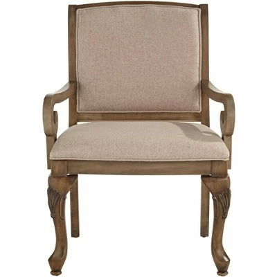 This upholstered accent chair comes from the Kensington Hill brand of designer furniture. Featuring a beige wooden frame with scrolling arms and decoratively carved legs, this elegant design is a great way to add graceful, vintage style to your living room and other areas. Beige fabric upholstery adds a gentle look and feel.