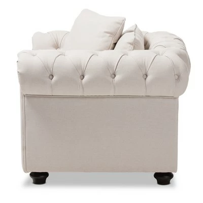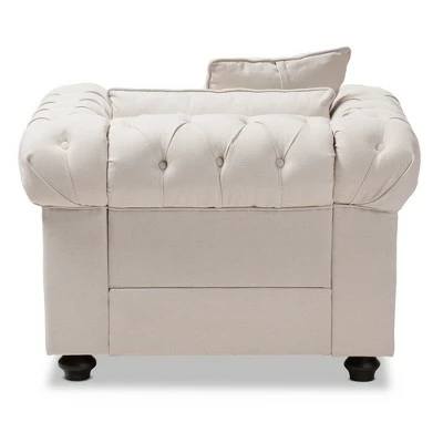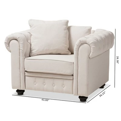 The low profile and plush rolled arms of the Alaise are the epitome of sophistication. This modern and classic-inspired chair is built to last with a wood frame and resting on four finished bun feet. The Alaise is an updated take on the Chesterfield style with button tufting on the arms, back, and front panel. The chair back and arms are foam-padded and upholstered in fabric for optimum comfort. The cushions of the Alaise are removable and comes with one matching pillow. of gorgeous details, subtle fabric piping outlines the chair. Add class, style, and a cozy place to lounge to your living room or any shared space. Made in China, the Alaise requires assembly. Dimensions: 28.38″ High x 43″ Wide x 36.25″ Deep; Seating Dimensions: 18.25″ High (from Floor) x 23.5″ Wide x 19″ Deep; Arm Height: 11″ High; Height (from Floor to Top of Arms): 28.38″ High; Back: 14.63″ High; Legs: 3″ High; Back Pillow: 14.63″ Wide x 24.5″ Long x 6.5″ Thick; Pillow: 18.63″ Wide x 18.63″ Long x 6.5″ Thick
