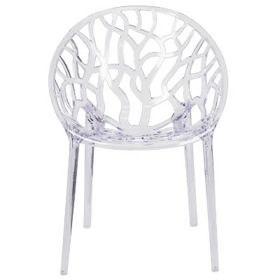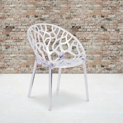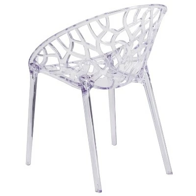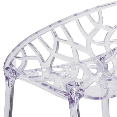 Make a beautiful and artistic statement with this transparent accent chair. With its intricate cut-out design and modern shape, you’ll fall in love with this chair. The transparency of the chair allows it to take up less visual space than a solid chair. This chair was crafted with an ingenious combination of lightness and strength. Due to its stacking capabilities, elegant design and use in indoor and outdoor locales this chair can be used in diverse environments. Additional Features: Floor Protector Rubber Glides, Suitable for Outdoor Use, Designed for Commercial Use