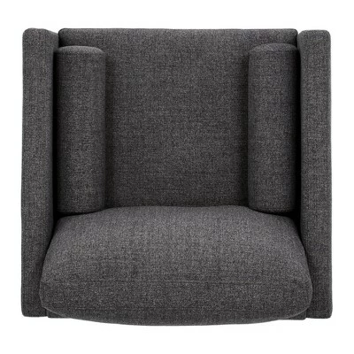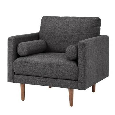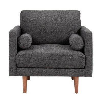 Complete your retro living space with the Hayden Tapered Leg Arm Chair with Pillows from iNSPIRE Q. The mid-century design is light and fresh, featuring tapered legs in a warm, walnut finish and black heathered upholstery. Lounge comfortably on plush, foam-filled cushions, supported by a resilient wooden construction. This simple chair makes matching with existing dΓ©cor easy so you can sit back and enjoy the finer things in life.