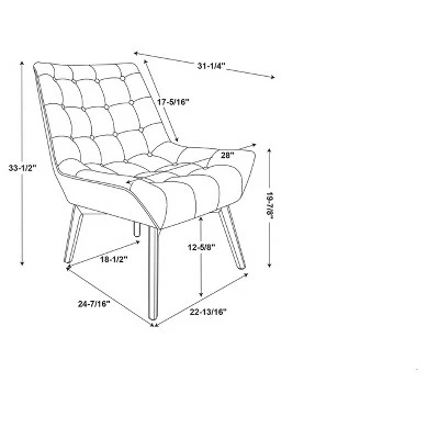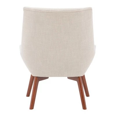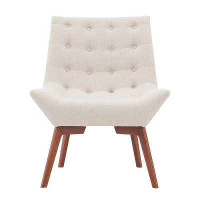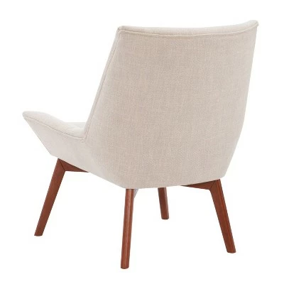 A unique, inviting and elegant shape sets this accent chair apart. Expert overall upholstery with button tufting in a woven beige fabric that is easy to clean. Solid wood legs in a walnut finish complement the seat and bring a mid-century feel to the piece. This highly tailored look will look perfect in any living room, family room, home office or den. Simple leg assembly.