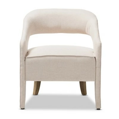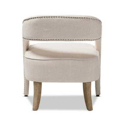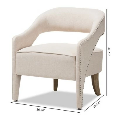 The gentle, swooping curves of the Floriane lounge chair invite you to relax in style. The modern and contemporary-inspired design incorporates smooth, curvaceous shapes with sophisticated details. The Floriane is upholstered in a delightful fabric from the chair back all the way down to the front legs, while the back legs are solid oak in a natural finish. The chair is foam-padded for comfort, with a curved chair back and arms to encourage hours of lounging. The Floriane also features a silver finished nailhead trim and subtle piping for extra details. This chair with an open back design will add modern vibes to your livingroom, reception area, or other shared spaces. Made in China, the Floriane comes fully assembled. Dimensions: 30.71″ High x 26.38″ Wide x 25.59″ Deep; Seating Dimensions: 18.9″ High (from Floor) x 22.05″ Wide x 19.69″ Deep; Arm Height: 4.33″ High; Height (from Floor to Top of Arms): 22.05″ High; Back: 12.2″ High; Legs: 9.45″ High